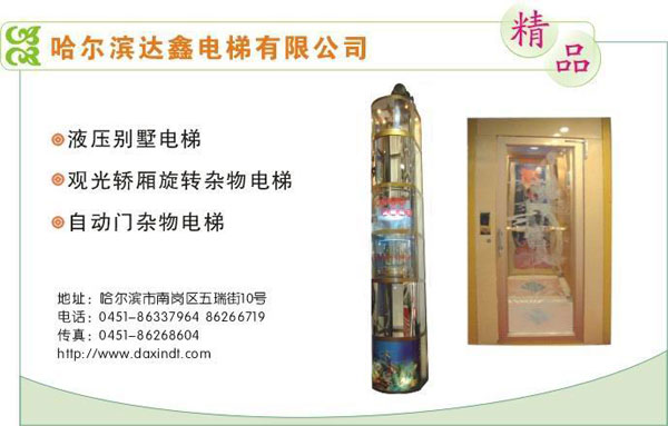 “达鑫”牌杂物电梯是经国家电梯质量检验中心鉴定,国家技术监督局认可的机电产品。并于2006年获得了国际ISO9001质量认证。其产品设计独特、制造精良、运行平稳、安全可靠,广泛用于饭店、宾馆、食堂、医院、图书馆、银行、商场等场所,是为小型货物提供快捷、方便运送的垂直运输设备。“达鑫”牌杂物电梯采用多种驱动方式及多种控制方式,速度分为0.4m/s(单速)和1.0m/s(变频调速),轿厢及厅门可适用不锈钢及钢板喷漆。工作方式分工作合式(取货方便)、地平式(便于小车进出),也可根据客户要求选做其它开门方式。